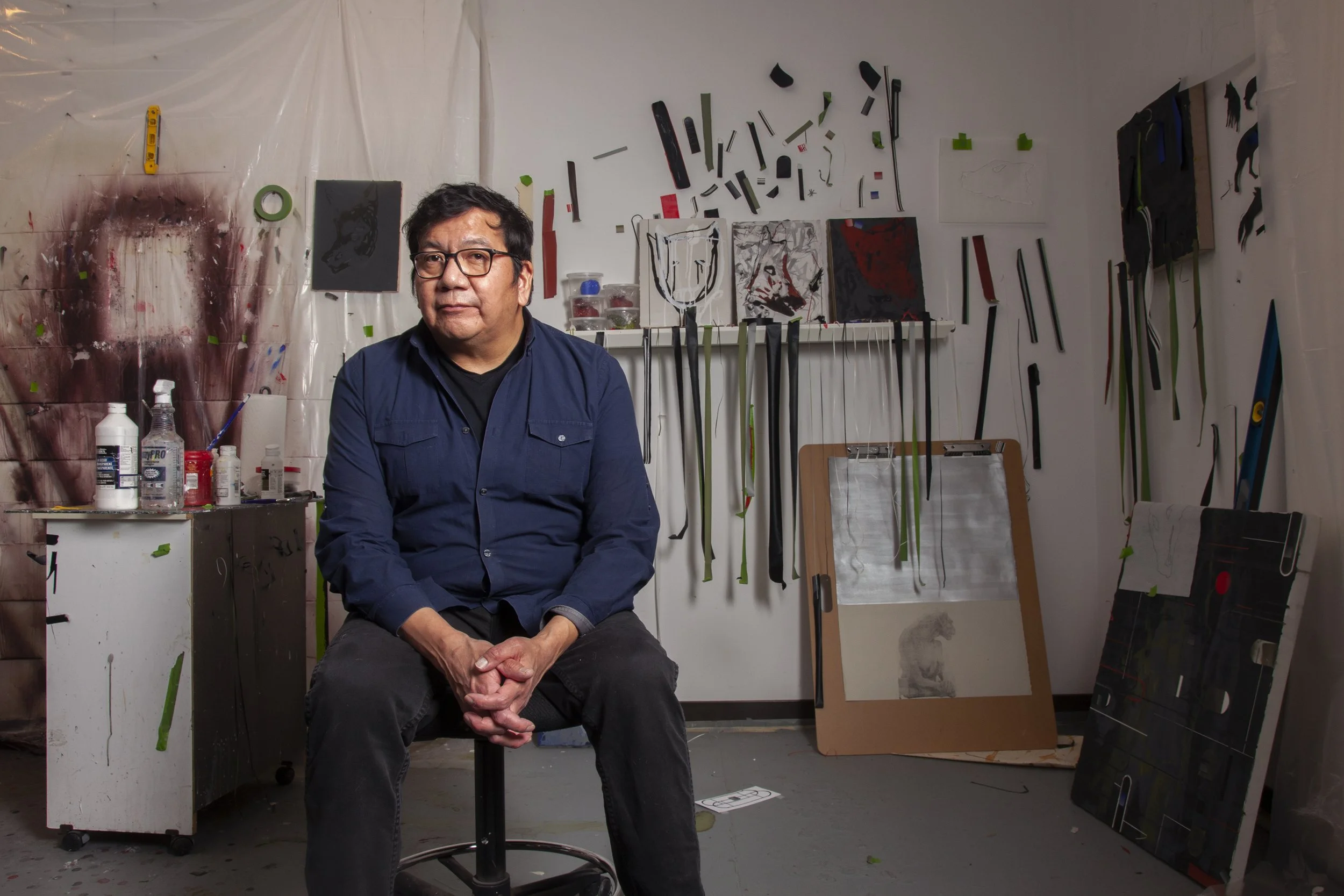 A Certain Cadence of Night is Duane Slick’s most recent one-person exhibition in Iowa. This is an ambitious showcase of his broad creative output and offers audiences an insight into his new and recent paintings, silkscreen prints, and an exciting video installation produced in collaboration with Martin Smick. Together, Slick’s work draws inspiration from many sources, including Native American storytelling, especially the Coyote character; Pop Art portraiture and multiples, conceptual theories of repetition; and how Native American artists are recontextualizing their work in art museums and collections.