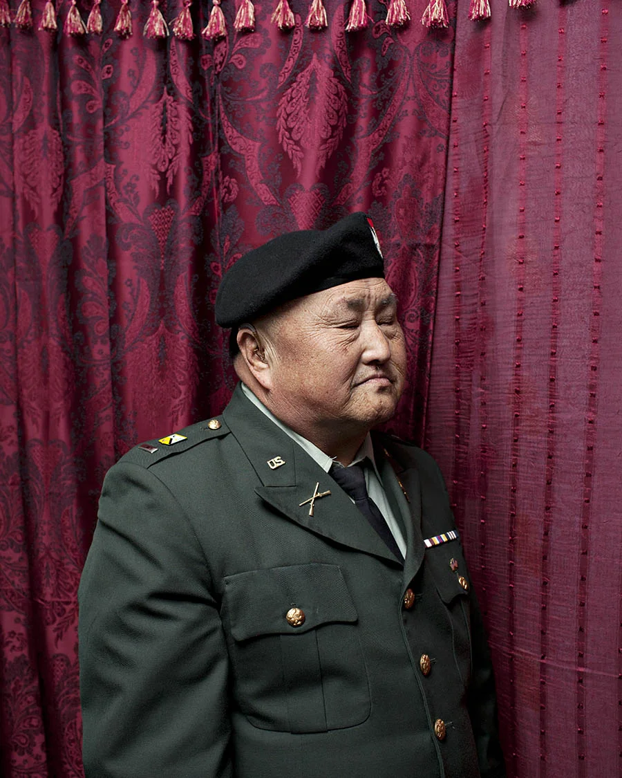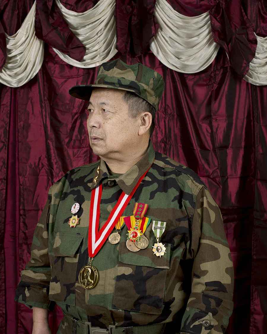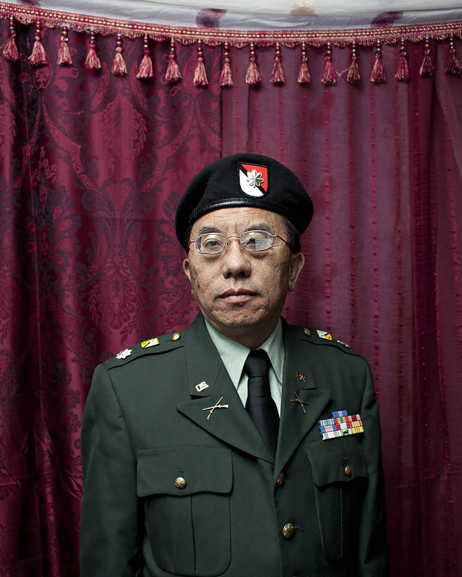“Attention!” is called when an officer enters a room occupied by enlisted personnel or cadets. I photographed these Hmong Vietnam War veterans from California, Wisconsin and Minnesota using tropes from the 19th century general paintings, Civil War soldier portraits and official presidential portraits. I did this to highlight their service in the Vietnam War because the United State military does not recognize them as American veterans. And because they are not recognized, Hmong veterans buy their own uniforms, medals and ribbons to insert themselves in the United States military and history. The uniforms they wear are important because it serves as a reminder of their services and their desire to be recognized by the United State Military. For these veterans, the war and their services are reminders of a life they gave up in Laos for their American allies, the very life they hope to someday go back to.